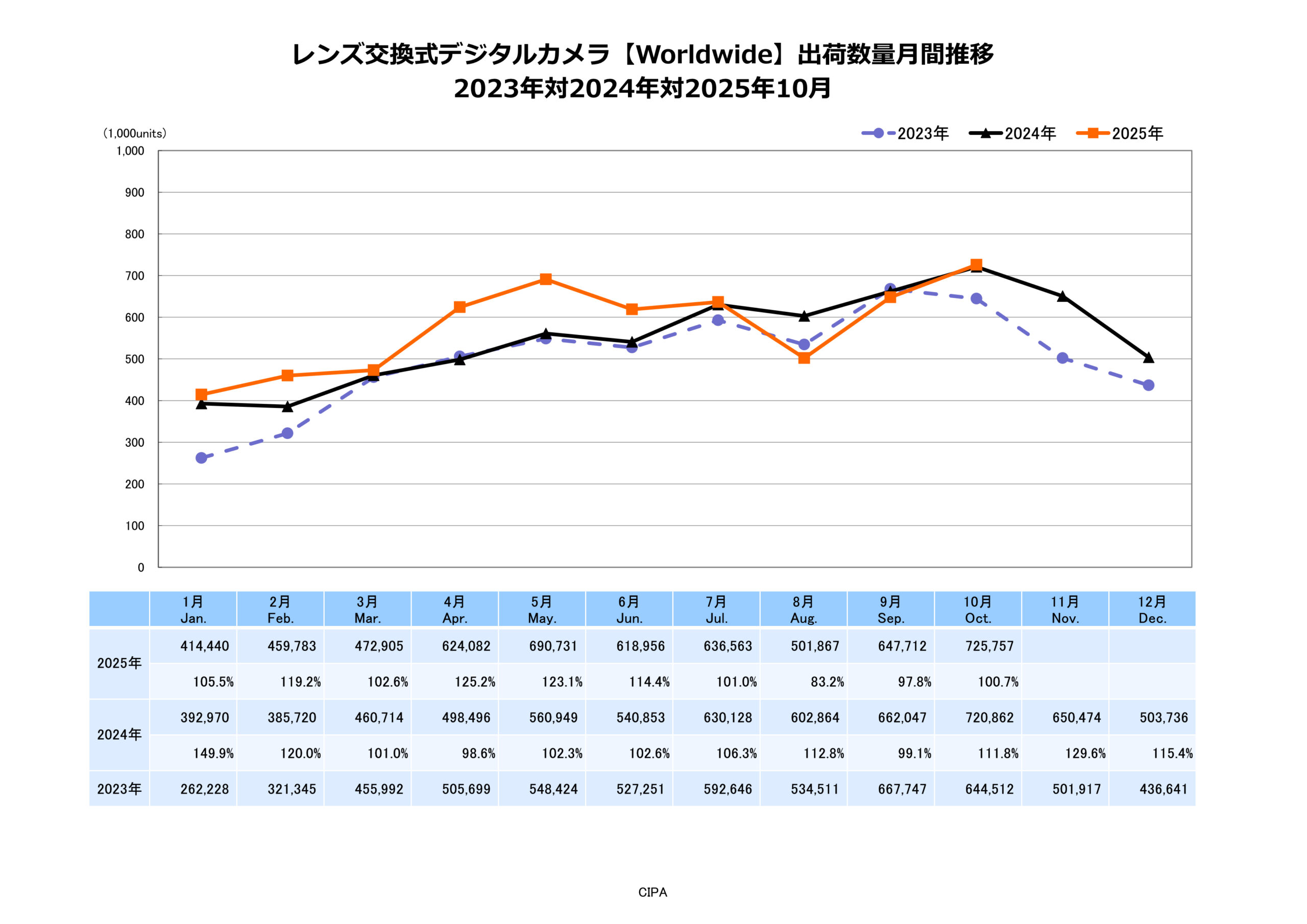 デジタルカメラの出荷数量をCIPAが発表しています。発表されたのは、2025年10月のレンズ固定式とレンズ交換式の出荷数量です。上記は資料を一部引用したものになりますので、すべての資料は本記事下部の記事元リンクからご覧ください。