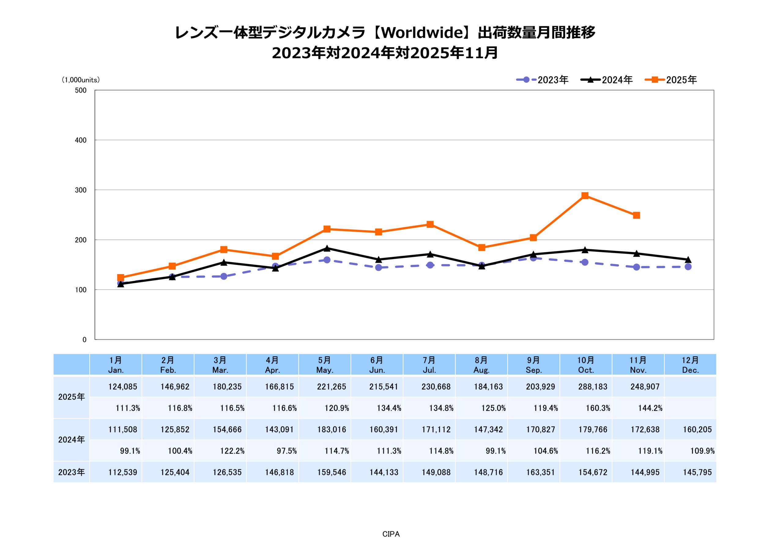 グラフをみるとコンパクトデジタルカメラが好調を維持しており、前年よりもかなり出荷数が伸びていることがわかります。10月はコンデジの新製品の効果で増えたのかなと思っていましたが、11月も出荷がかなり多く好調を維持していることがわかりますね。