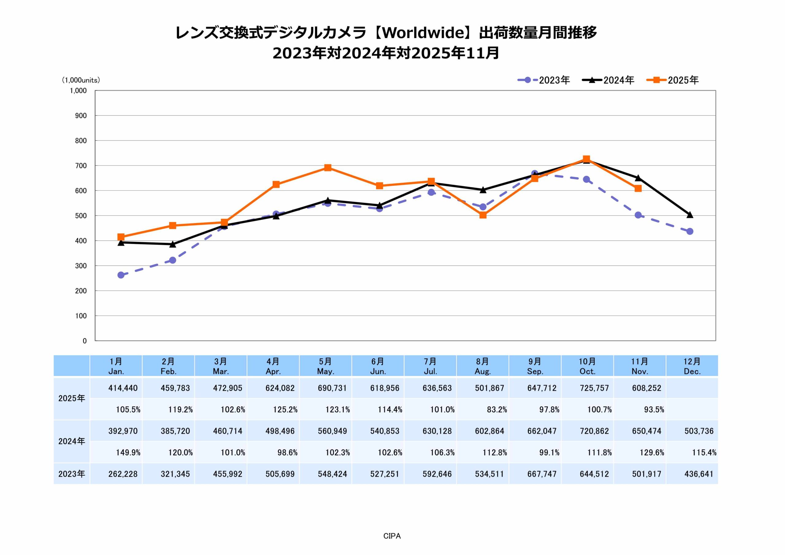 デジタルカメラの出荷統計をCIPAが発表しています。上記はレンズ交換式、レンズ固定式のカメラの統計グラフになり、より詳細な統計もありますので、すべての統計は本記事下部の記事元リンクからご覧ください。