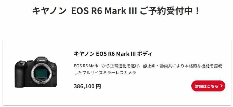 カメラのキタムラでは、EOS R6 Mark IIIの価格は38万6100円となっています。キヤノンの公式通販価格は42万9000円でしたので、そこから10%低い価格ということで、いつもの通りの価格設定です。それでも、30万円台になると割安感を感じますね。