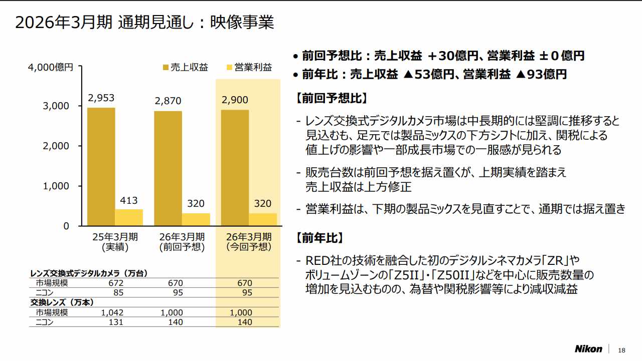 決算の説明会資料によれば、2026年3月期の上半期の映像事業は、前年よりも下回っているものの、前回の予想よりも上回る売上となっており、想定以上の実績は出せているようですね。しかし、レンズ交換式デジタルカメラの売上は前年度と比較して7万台増えており、さらに交換レンズについても2万本増えているということで、販売台数そのものは好調のようです。