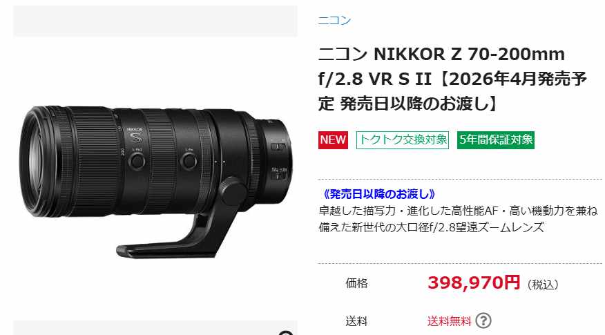 カメラのキタムラによれば、NIKKOR Z 70-200mm f/2.8 VR S IIは「2026年4月の発売日以降のお渡し」との表記がされており、発売日当日の入手が困難であることが示唆されています。通常、カメラのキタムラでは新製品に対して「発売日当日にお渡し」といった表記がされることが多いですが、本製品については「以降」との記載となっており、発売日に手に入れるのは難しいと見られます。