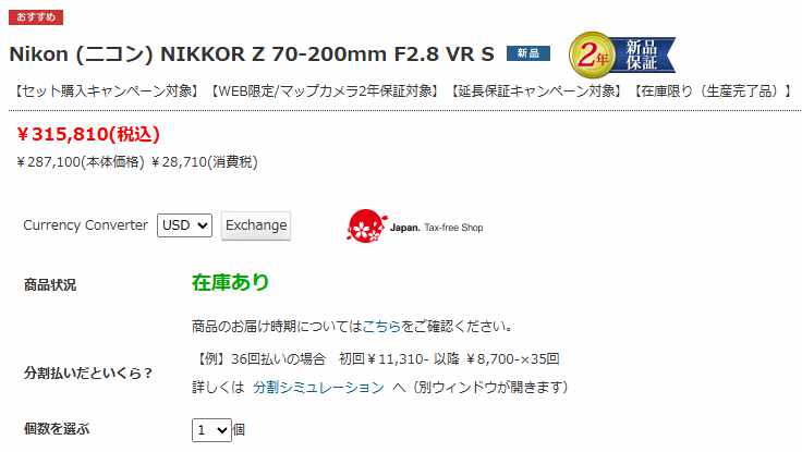 NIKKOR Z 70-200mm F2.8 VR Sの生産が完了していることがマップカメラの製品ページから明らかになりました。