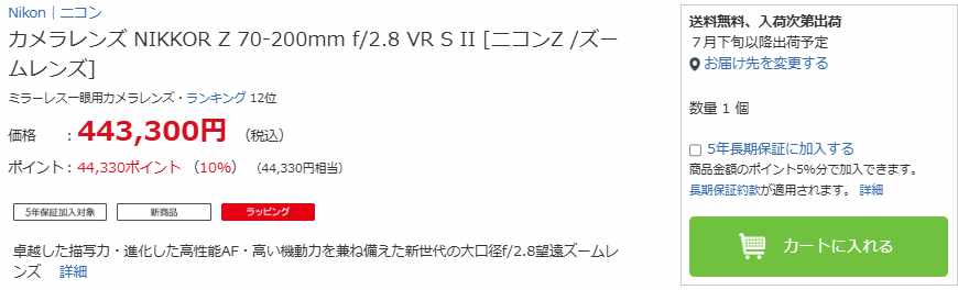 ビックカメラのNIKKOR Z 70-200mm f/2.8 VR S IIの製品ページによれば、現在、製品は入荷次第出荷との表記になっており、手に入れるまで時間がかかることがわかります。納期の予定ですが、製品ページには7月下旬以降の出荷となっており、最低でも3か月ほど待たなければならないようです。