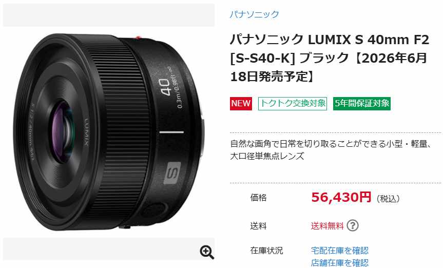 パナソニックのミラーレスデジタルカメラ用の交換レンズとなるLUMIX S 40mm F2の予約が開始されました。発売予定日は2026年6月18日に決定、売り出し価格はカメラのキタムラで5万6430円となっています。もともと希望小売価格が6万2700円でしたので、ちょうど90%の価格が売り出し価格となりました。