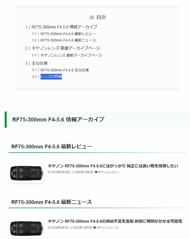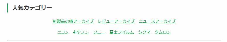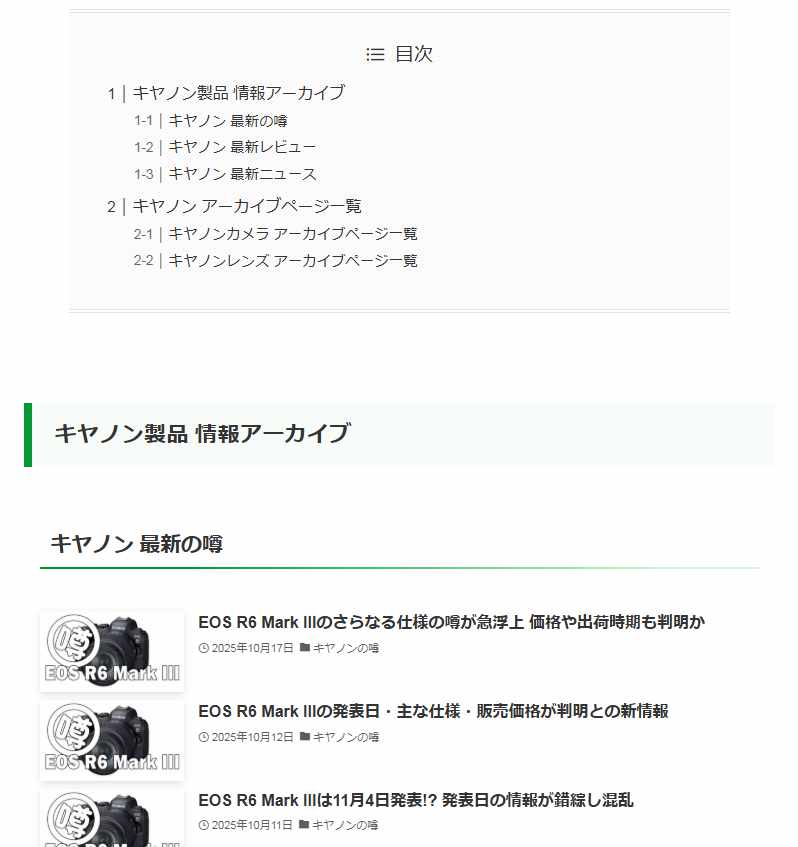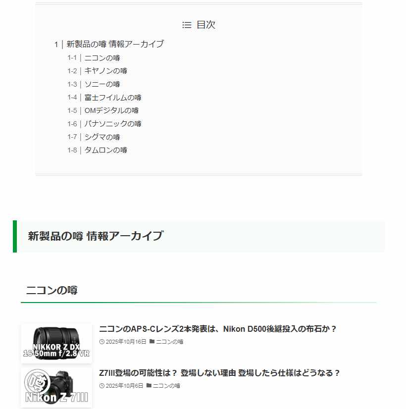 特定のメーカーの情報の一覧や、特定のメーカーの新製品の噂の一覧、特定カメラや特定レンズの情報の一覧を表示することができるように、新たにページを作成したり、リンク関係を見直しました。
