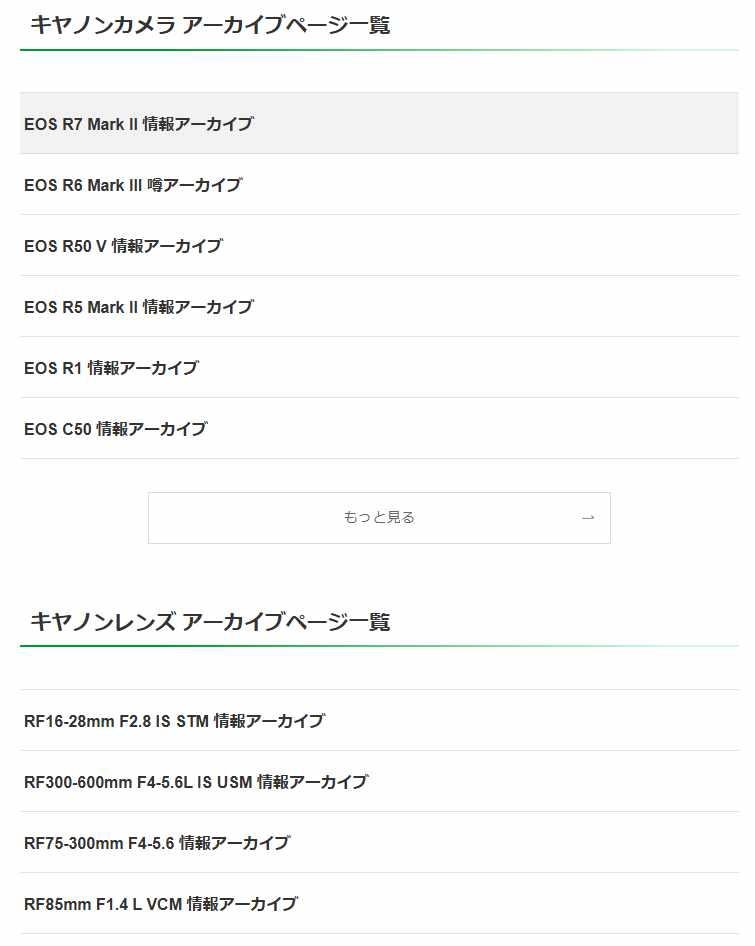 メーカー別情報アーカイブページに、特定メーカーのカメラ、レンズの一覧が表示されていますので、このリンクから製品別情報アーカイブを表示させることができます。
