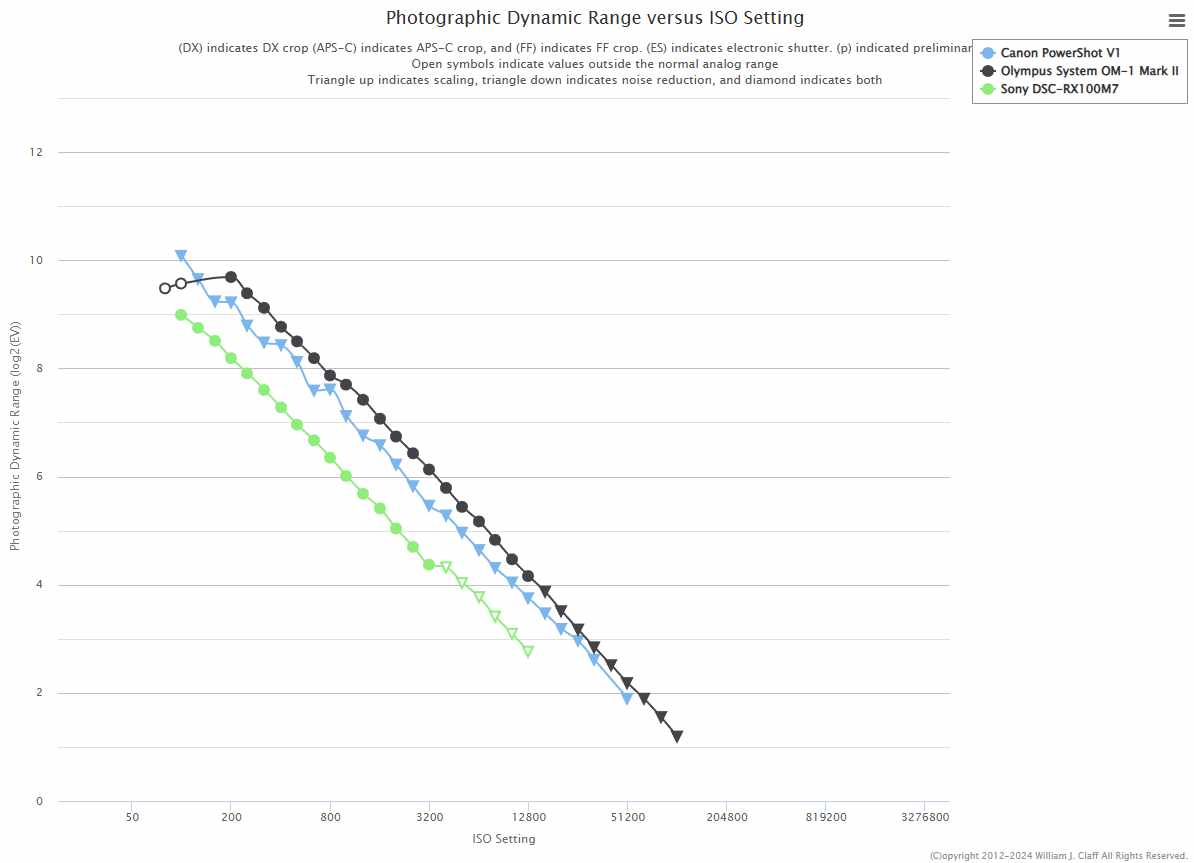 またPowerShot V1はISO値によってダイナミックレンジの結果がリニアに変化していくのではなく、かなり曲がりくねったようなグラフになっていることがわかります。このあたりも興味深いところですね。