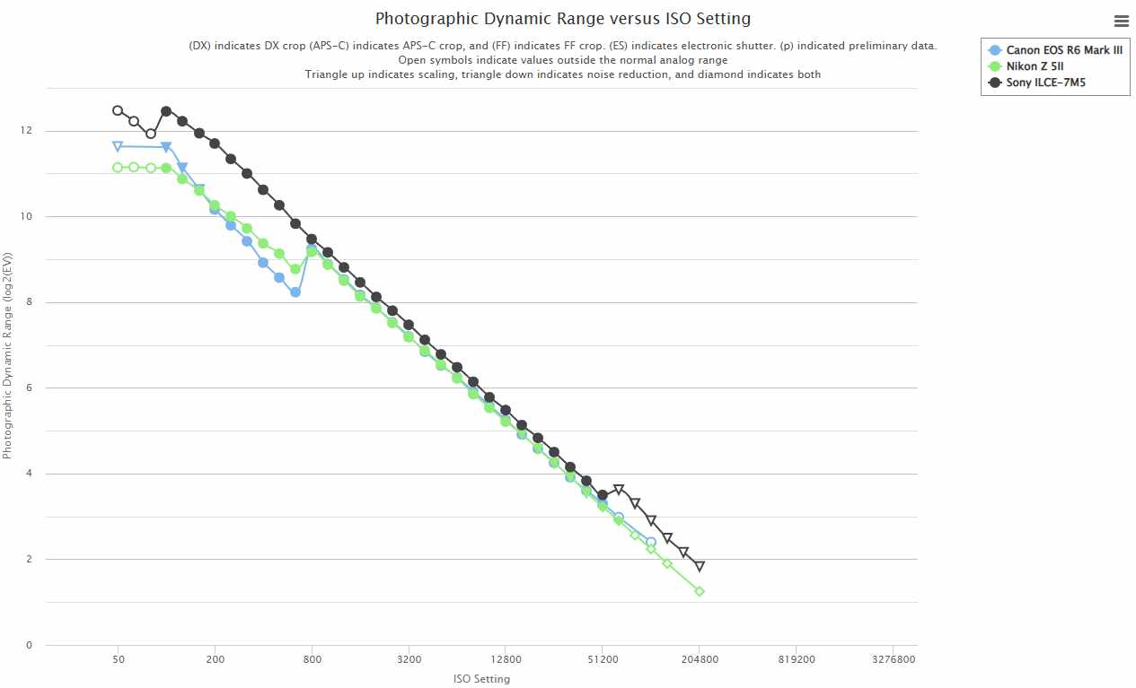 グラフの見方ですが、以下、白黒や色に関係なく●(マル)がノイズリダクションされていないことを示しています。▼(下向き三角)はノイズリダクション処理されており、▲(上向き三角)はスケーリング処理されていることを示しています。また黒塗り(色塗り)は常用ISO、白塗りは拡張ISOであることを示しています。