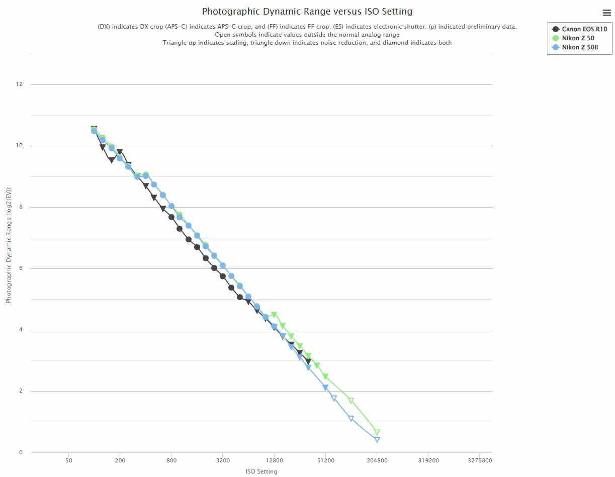 EOS R10との比較ですが、EOS R10のほうが画素数が多いため、ややNikon Z50IIのほうが結果が良くなっているようですね。また、デュアルゲインコンバージョンが切り替わるISO値もニコンとキヤノンで異なっており、キヤノンではISO200から高ゲインに、ニコンではISO400から高ゲインに切り替わる仕様になっているようですね。
