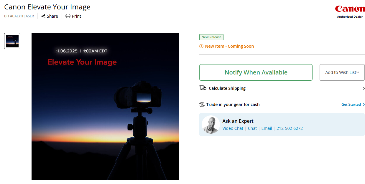 B&Hのサイトには謎の製品ページが公開されており、そこに先日、キヤノンが公開したティザー画像が貼られています。そしてサイトには東部標準時間の2025年11月6日午前1時に発表との記述があることがわかります。