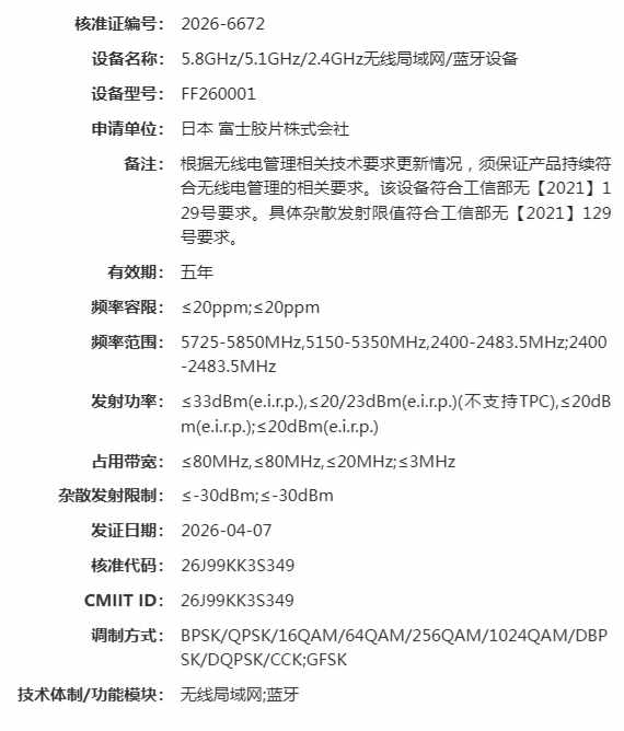 今回の認証をみるとわかりますが、5.8GHz、5.1GHz、2.4GHzのWi-Fiと、Bluetooth(2.4GHz)の認証を受けていることがわかります。このことから海外のSNSでは、トライバンドのWi-Fiを搭載した富士フイルムのまったく新しいプラットフォームの製品ではないかと指摘する声が聞かれます。