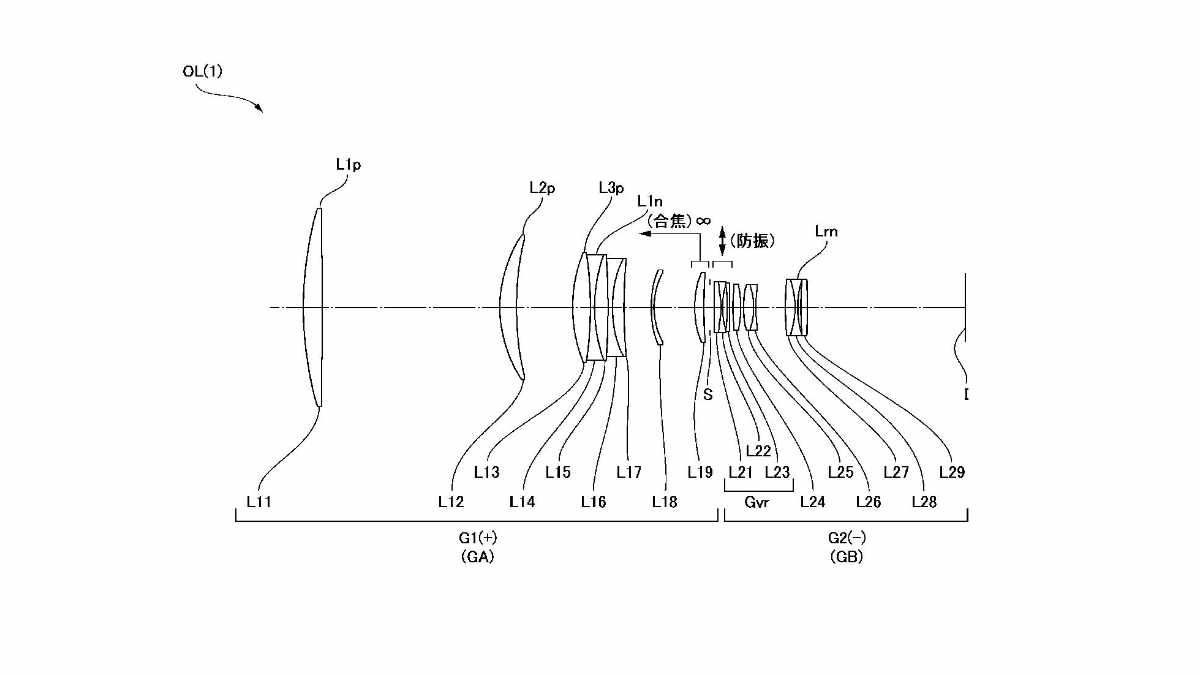 構成としては、前方に複数の正レンズをまとめ、その中に1枚だけ負レンズを組み込むことで、従来よりもレンズ径を抑えつつ、色収差も効率よく補正できるようにしているようです。さらに後段には補正用のレンズ群が配置され、ここに光軸と直交方向へ動く手ぶれ補正を組み込みやすい構造になっていると読み取れます。つまり、超望遠ながら光学式手ぶれ補正を前提とした設計思想のようです。