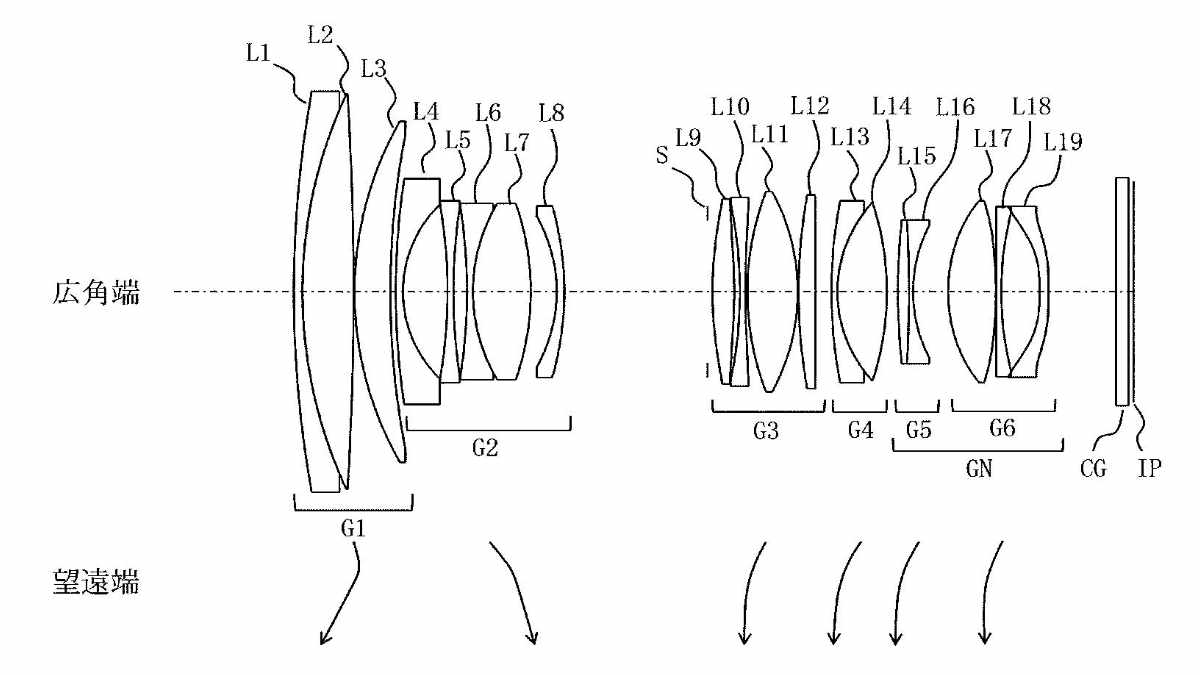 この特許は簡単にいうと、 「大口径(F2.0前後)ながら、小型で、高速AFに適した標準域のズームレンズ」 を実現するための光学系について述べたものです。特許を読むと、バックフォーカスが短いためミラーレスカメラ用のレンズで、像高からフルサイズ用のレンズであることがわかります。