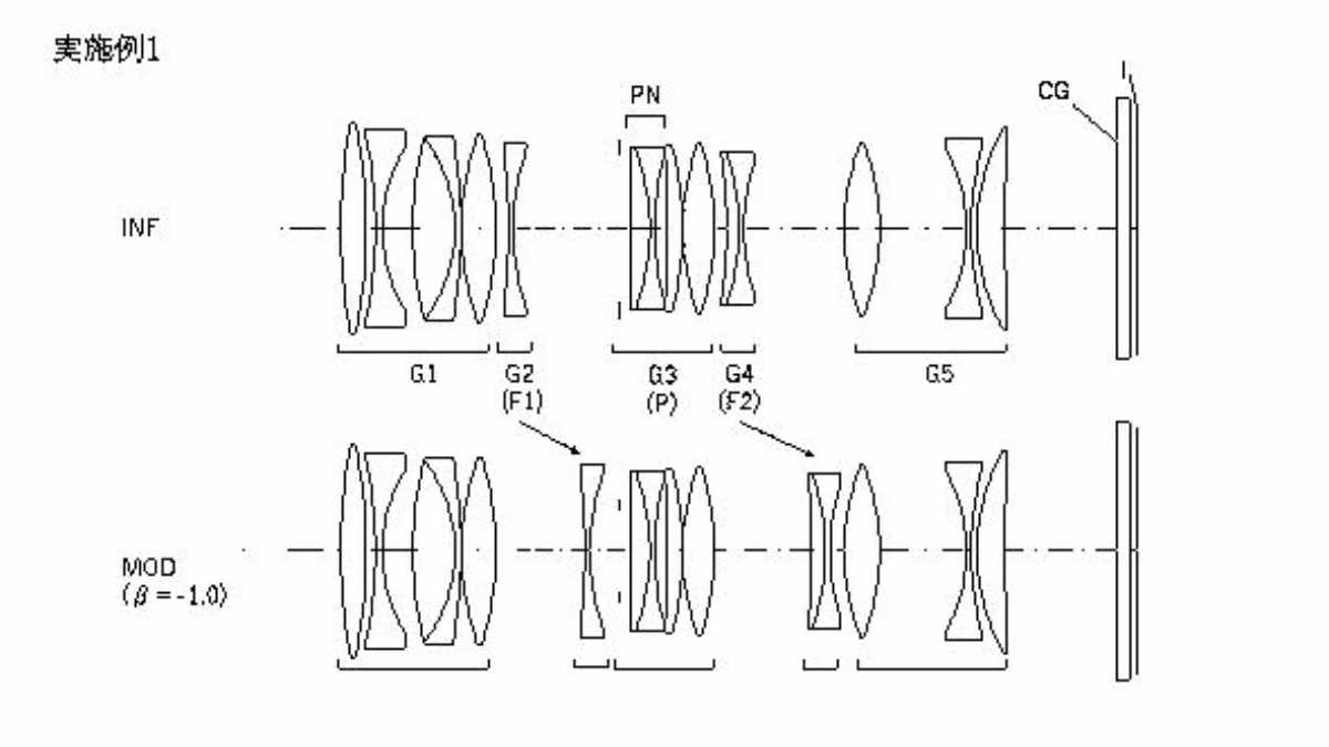 発明の中身としては、レンズの配置を工夫してフォーカス群を軽量化しつつ、球面収差やコマ収差を良好に補正できるようにしており、さらに無限遠から至近までの高い光学性能とレンズ全体の小型軽量化を実現するという設計になっているようです。